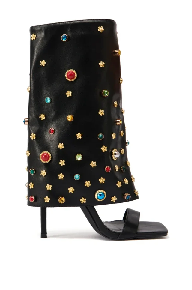 An Open Toe Sandal Boot Features A Faux Leather Upper, A Mid-calf Fold-over Shaft Height, A Squared Open Toe, A Slim Coordinating toe Band, And Cushioned Insoles For Ideal Comfort. Complete With A Slightly Covered Stiletto Heel, All-over Rhinestone Gemstone Detailing, Faux Gold Metallic Accents, And A Tonal Inner Ankle Zipper Closure.
