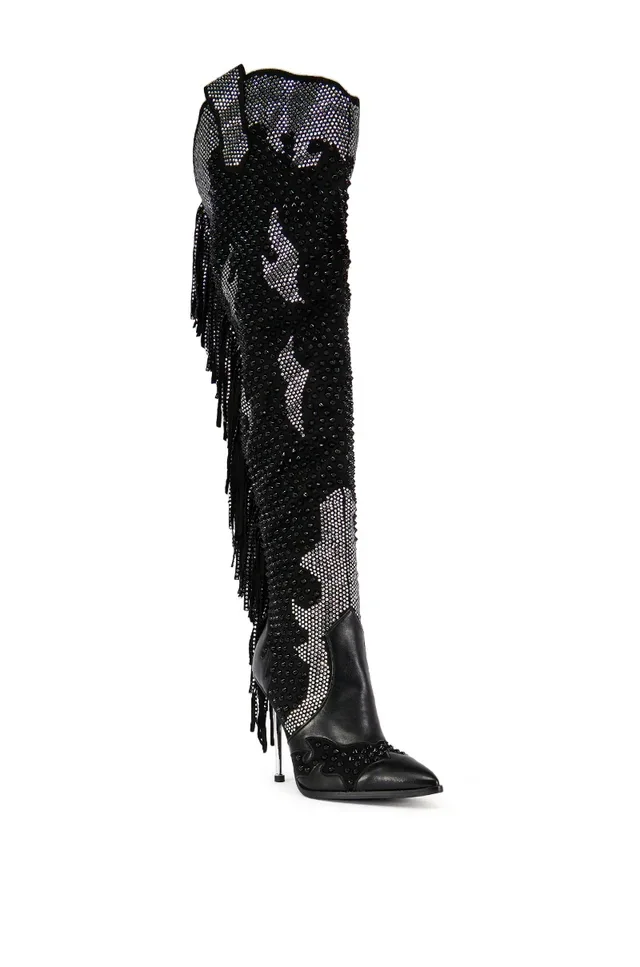 These Bedazzled Boots Are Crafted From A Supple, Suede-like Upper And Boast A Thigh-high, Pointed Toe Silhouette, A Silver, Sky-high Stiletto Heel, And Western-inspired Stitching And Faux Leather Paneling. They’re Complete With An Inner-ankle Zipper Closure, Pull-on Tabs, All-over Rhinestone And Stud Embellishments, And Dazzling, rhinestone-adorned Fringe.