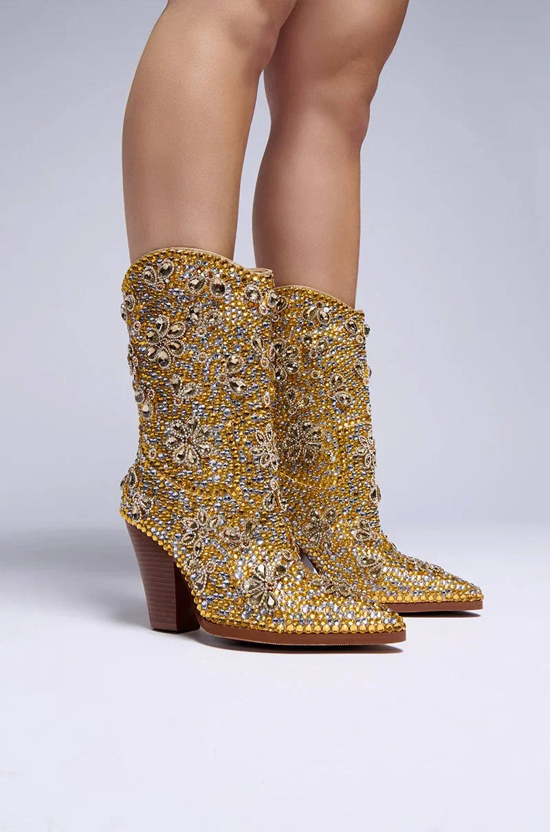 These Dazzling Mid-calf Booties Feature A Faux Leather Upper, A Glittery Textile Base, A Rounded Top Shaft, A Chunky Stacked High Heel, A Pointed Toe Silhouette, A Textured Rubber Outsole, A Comfy Cushioned Footbed, And A Pull-on Fit. Complete With Pave Gemstone Embellished Body Detailing, As Well As Floral-inspired Rhinestone Pendant Appliques Scattered Throughout. Pair These Bad Boys With Metallic Bodycon Dresses For An Ultra-glam Finish.