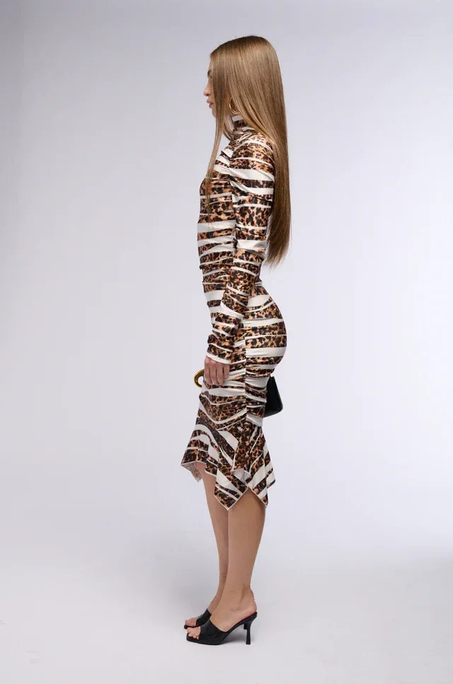 A Sleek, Stretchy Bodycon Number That Features Cheetah Print Patterning, Contrast Color Block Stripes, A Mock Neckline, Long Sleeves, And Inner Elastic Banding That Results In Ruched Body Detailing Throughout. Complete With A Midi Length, A Pointed Mermaid Hemline, And A Pull-on Fit.