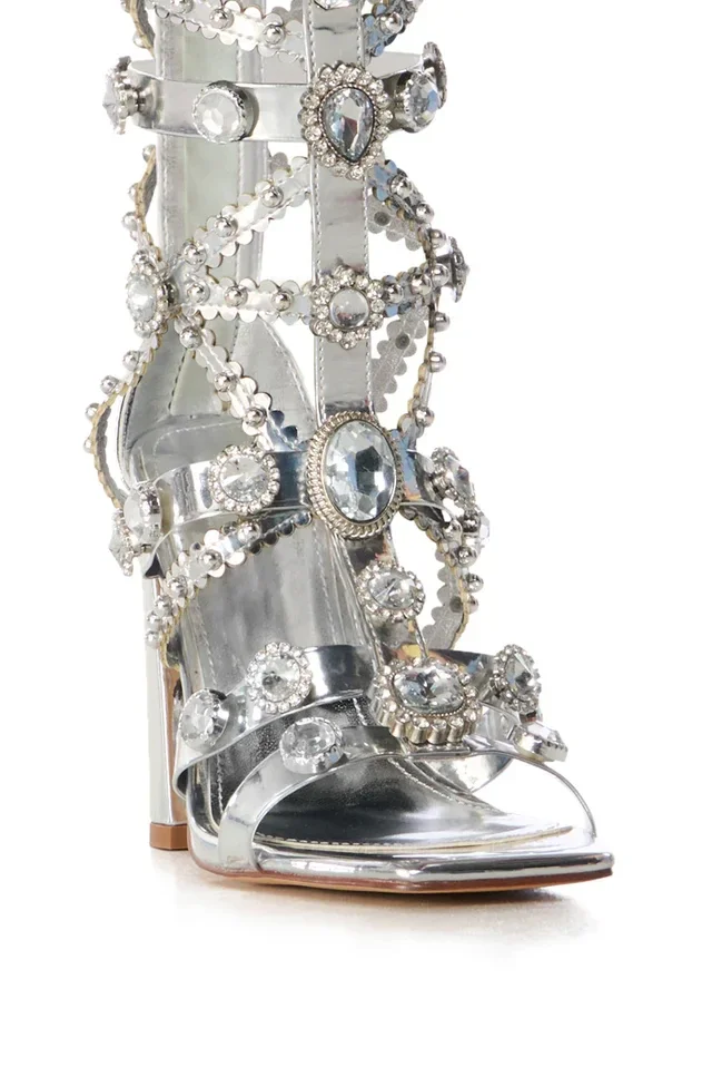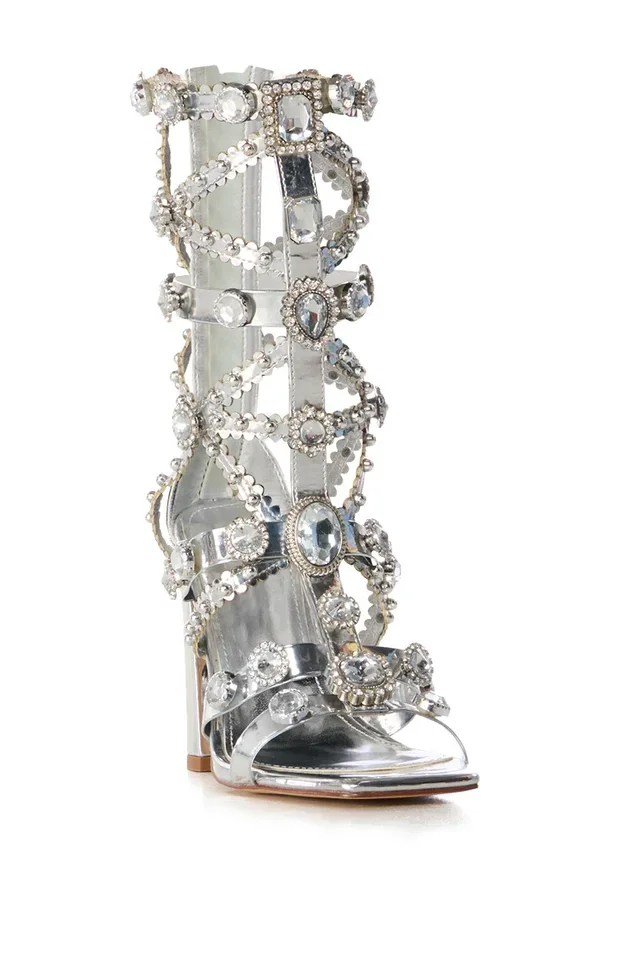 These Strappy Gladiator Sandals Are Crafted Using A Metallic Faux Leather Upper And Feature A Mid-calf Shaft, An Open Square Toe Silhouette, A Comfortable Tonal Cushioned Insole, Faux Silver Metallic Hardware, A Towering Chunky Heel With A Reflective Finish, And A Cut Out Cage-like Construction With Scalloped Trim Detailing. Complete With Opulent Assorted Gem And Rhinestone Embellishments, Decorative Circular Studs, Tonal Stitching, And A Back Ankle Zipper Closure. Pair This Style With A Metallic Top And A Mini Length Skirt For A Fierce Finish.