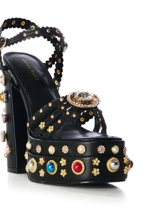 Crafted From A Faux Leather Upper, These Detailed Sandals Feature An Open Squared Toe Silhouette, A Cushioned Insole, Gold-toned Hardware, Clustered Strappy Toe Bands With Studded Detailing, And An Ornate Embellished Gemstone Pendant In The Center. Complete With A Rhinestone, Gem, Floral Pendant, And Pearl-embellished Towering Chunky Heel, An Equally Embellished Coordinating Platform Stacked Sole, And A Buckled Ankle Strap Closure.