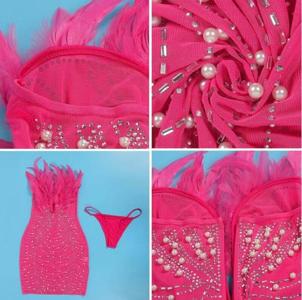 High Stretch Fabric, With The Option To Size Down For A Snug Fit. It Is Ideal For Various Body Types, From Petite To Curvy. This Dress Features A Sheer Material Embellished With Sparkling Sequin Faux Pearls And Luxurious Feathers.